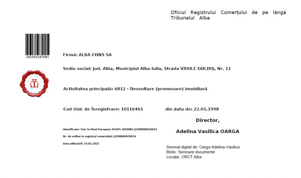 ALBA CONS SA detine arhiva proprie incepand cu anul 1998 de cand a luat fiinta si este inregistrata la Of. Registrului Comertului Alba.